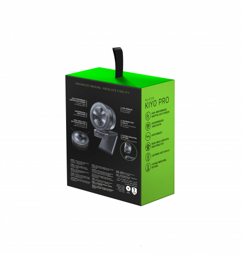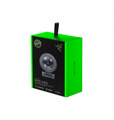 Razer Kiyo Pro. Megapixeles: 2,1 MP, Máxima resolución de video: 1920 x 1080 Pixeles, Velocidad máxima de cuadro: 60 pps. Interfaz: USB, Color del producto: Negro, Tipo de montaje: Clip/Soporte. Sistema operativo Windows soportado: Windows 10,Windows 8. Ancho: 68,7 mm, Profundidad: 68,7 mm, Altura: 48,5 mm. Tipo de embalaje: Caja, Ancho del paquete: 171 mm, Profundidad del paquete: 130 mm