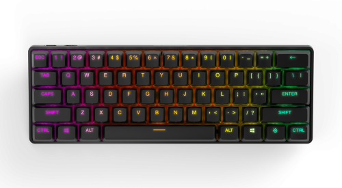 - Sistema operativo Windows soportado: Windows 10,Windows 11,Windows 8.1 - Sistema operativo MAC soportado: Mac OS X 10.13 High Sierra, Mac OS X 10.14 Mojave, Mac OS X 10.15 Catalina, Mac OS X 10.15.3 Catalina - Alimentación: Batería - Teclado tipo de batería: Batería integrada - Autonomía: 40 h - Recargable: Si - Fuente de carga: USB Tipo C - Uso recomendado: Juego - Interfaz del dispositivo: USB + RF Wireless + Bluetooth - Interruptor del teclado: Interruptor mecánico - Diseño de teclado: QWERTY - Idioma del teclado: Inglés de EE. UU. - Dispositivo apuntador: No - Formato del teclado: 60% - Teclado numérico: No - Vida útil de las teclas del teclado: 100 millón de caracteres - Teclas de Windows: Si - Teclas rápidas programables: Si - Keyboard key switch technology: SteelSeries QX2 RGB OmniPoint - Frecuencia de banda: 2.4 GHz - Memoria incorporada: Si - Manual de usuario: Si - Número de productos incluidos: 1 pieza(s) - Receptor incluido: Si - Interfaz de receptor inalámbrico: USB Tipo C - Cable extraíble: Si - Color del producto: Negro - Coloración de superficie: Imagen - Retroiluminación: Si - Tipo de retroiluminación: LED RGB - Color de luz de fondo: Varios - Altura de teclado ajustable: Si - Ratón incluido: No - Conector USB: USB Tipo C