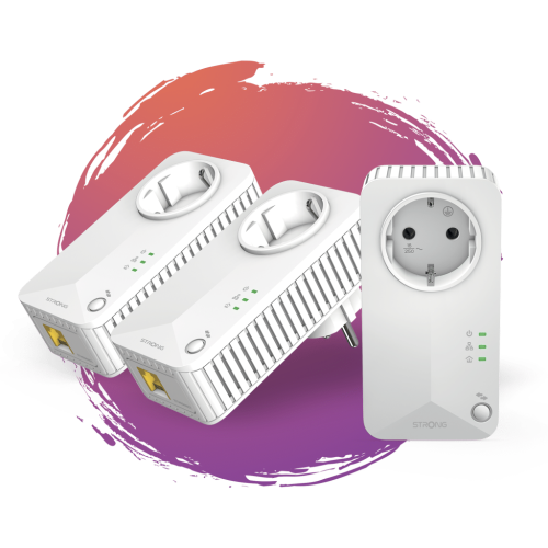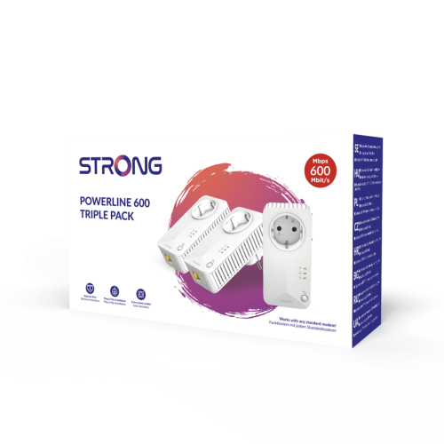 Strong Powerline 600 Triple Pack EU V2. Rango máximo de transferencia de datos: 600 Mbit/s, Estándares de red: IEEE 802.3, IEEE 802.3u, Tipo de interfaz Ethernet LAN: Ethernet rápido. Voltaje de entrada AC: 100 – 240 V, Frecuencia de entrada AC: 50/60 Hz, Corriente: 16 A. Color del producto: Blanco, Tipo de antena: Interno. Sistema operativo Windows soportado: Windows 11, Windows 7, Windows 8, Windows 8.1. Ancho: 60 mm, Profundidad: 74 mm, Altura: 117 mm