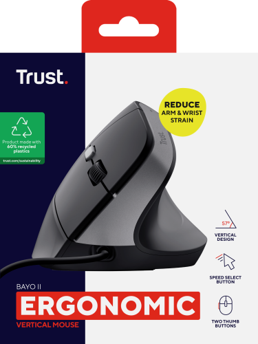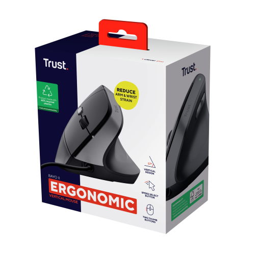 Trust Bayo II. Factor de forma: mano derecha, Diseño vertical. Interfaz del dispositivo: USB tipo A, Resolución de movimiento: 2400 DPI, Cantidad de botones: 6, Tipo de desplazamiento: Rueda. Fuente de energía: Cable. Color del producto: Negro