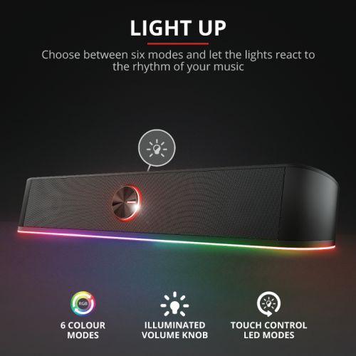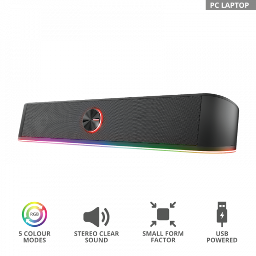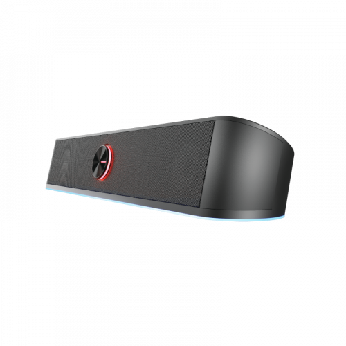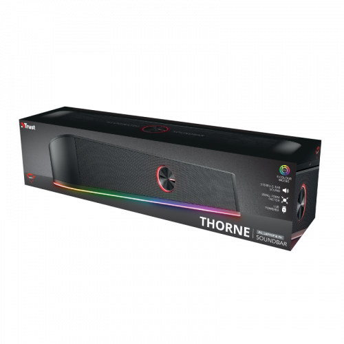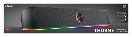 Trust GXT 619 Thorne. Canales de salida de audio: 2.0 canales, Potencia estimada RMS: 6 W, Salida de pico de potencia musical (PMPO): 12 W. Potencia de la barra de sonido del altavoz RMS: 3 W, Obstrucción: 4 Ω. Color del producto: Negro. Tecnología de conectividad: Alámbrico. Ancho: 400 mm, Profundidad: 75 mm, Altura: 70 mm