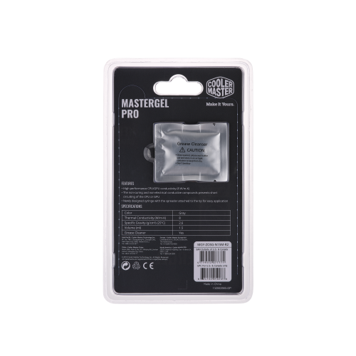 Cooler Master MasterGel Pro. Conductividad térmica: 8 W/m·K, Densidad: 2,6 g/cm³, Color del producto: Gris. Volumen: 1,5 ml. Tipo de embalaje: Ampolla