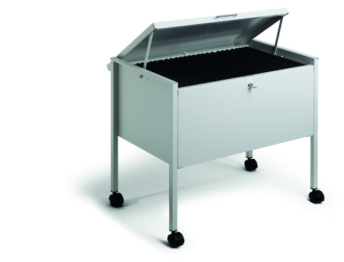 Carrito para carpetas colgantes en chapa de acero resistente al rayado. Para aprox. 80 carpetas colgantes A4.Con tapa con llave, 4 ruedas, de las cuales 2 con freno. El suministro se realiza desmontado con instrucciones de montaje.