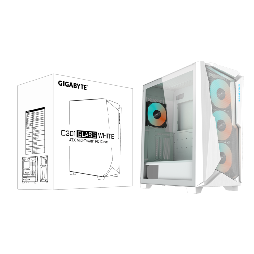 GIGABYTE C301GW. Factor de forma: Midi Tower, Tipo: PC, Color del producto: Blanco. Ventiladores frontales instalados: 3x 120 mm, Ventiladores traseros instalados: 1x 120 mm. Tamaños de disco duro soportados: 2.5,3.5″, Factor de forma de disco SSD: 2.5″. Ancho: 220 mm, Profundidad: 473 mm, Altura: 486 mm. Ancho del paquete: 282 mm, Profundidad del paquete: 530 mm, Altura del paquete: 530 mm