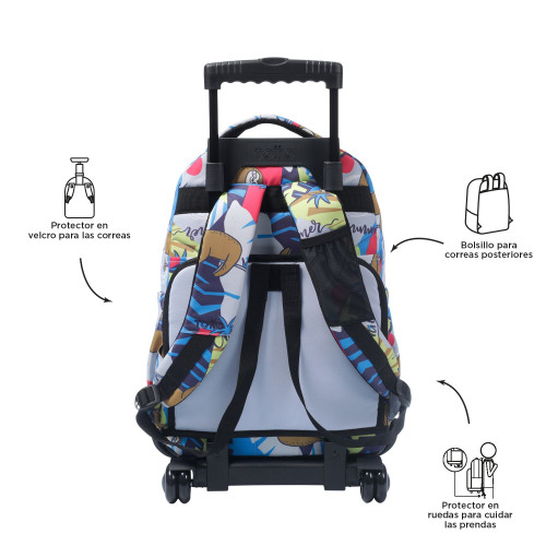 El modelo Renglones es nuestra mochila escolar con ruedas en tamaño grande y está pensada para cuidar la espalda de los peques llevando el peso cómodamente con el carro evitando trayectos interminables cargados de libros. La gran variedad de estampados te permite elegir la que más se ajusta a sus gustos y colores favoritos. ¡No te la pierdas! Capacidad 35 litros.