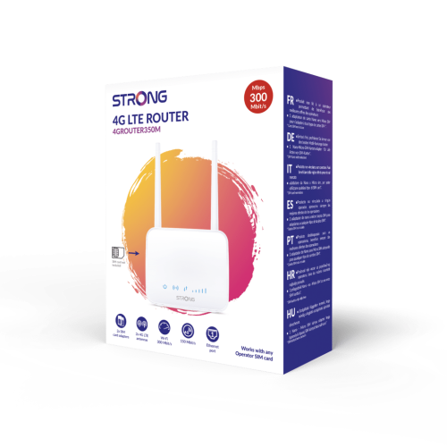 Strong 4GROUTER350M. Tipo de dispositivo: Router de red móvil, Color del producto: Blanco, Posicionamiento de mercado: Hogar. Tipo de interfaz Ethernet LAN: Ethernet rápido, Ethernet LAN, velocidad de transferencia de datos: 10,100 Mbit/s, Estándares de red: IEEE 802.11b, IEEE 802.11g, IEEE 802.11n, IEEE 802.3, IEEE 802.3u. Wi-Fi estándares: 802.11b, 802.11g, Wi-Fi 4 (802.11n), WLAN velocidad de transferencia de datos, soportada: 300 Mbit/s, Frecuencia Wi-Fi: 2,4 GHz. Red de datos: LTE, Estándares 2G: Edge, GPRS, GSM, Estándares 3G: DC-HSPA+, HSPA, HSPA+, UMTS. Algoritmos de seguridad soportados: WPA, WPA-PSK, WPA2, WPA2-PSK, WPS