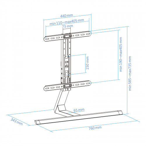 Soporte de mesa de aluminio para pantallas 32"-65"- Pantallas soportadas: 32"-65"- Compatible con VESA: 200x200, 300x200, 300x300, 400x200, 400x300 y 400x400- Peso máximo soportado de pantalla: 40 kg- Rango de ajuste para la altura del soporte: 735-585 mm- Altura máxima del soporte: 735 mm- Medidas de la peana: 760x343 mm- Sistema de organización de cables- Incluye almohadillas de silicona- Compatible con pantallas curvas- Material: Aluminio- Color: Negro- Peso neto: 4,2 kg. Peso bruto: 4,92 kg- Medidas del embalaje: 765x245x95 mmContenido del Paquete- 1 x Soporte- 1 x Kit montaje (incluye herramientas)- 1 x Manual de instalación