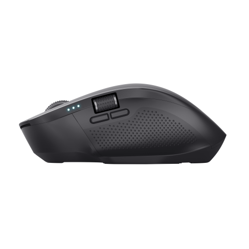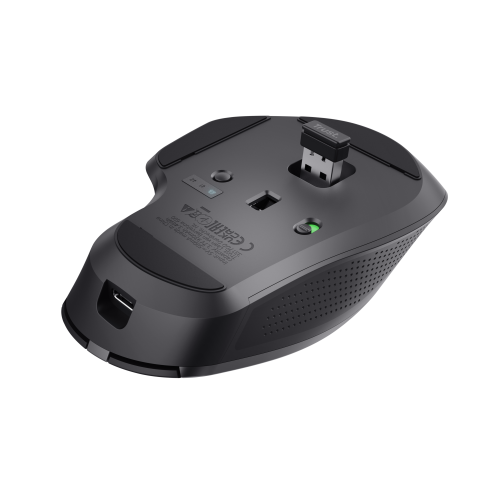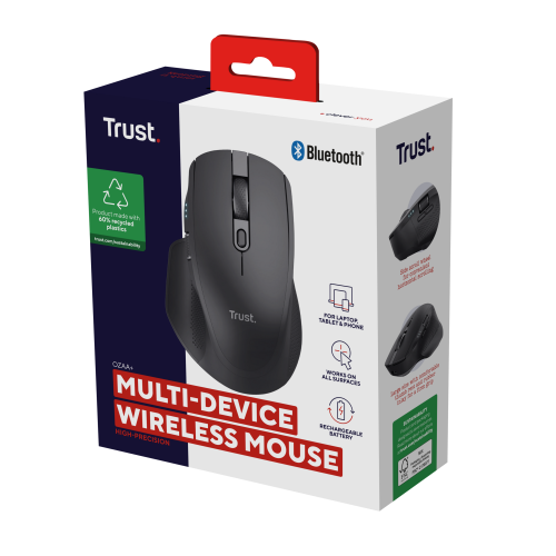 Trust Ozaa+. Factor de forma: mano derecha. Tecnología de detección de movimientos: Óptico, Interfaz del dispositivo: RF Wireless + Bluetooth, Resolución de movimiento: 3200 DPI, Tipo de botones: Botones presionados, Cantidad de botones: 6, Tipo de desplazamiento: Rueda. Fuente de energía: Baterías/Cable. Trabaja en cualquier superficie. Color del producto: Negro