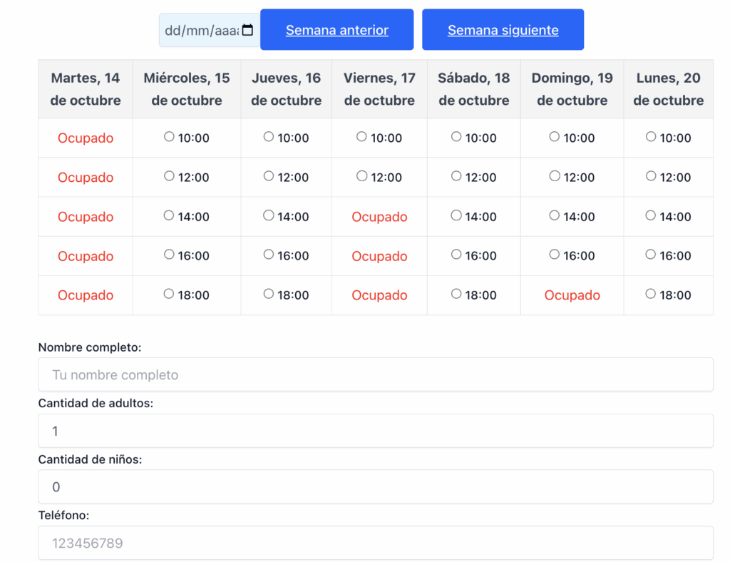 Hemos propuesto una solución sencilla para el cliente y el visitante: mostrar un calendario semanal navegable, con los días y franjas disponibles claramente marcados, y permitir reservas aportando el número de teléfono por parte del cliente.